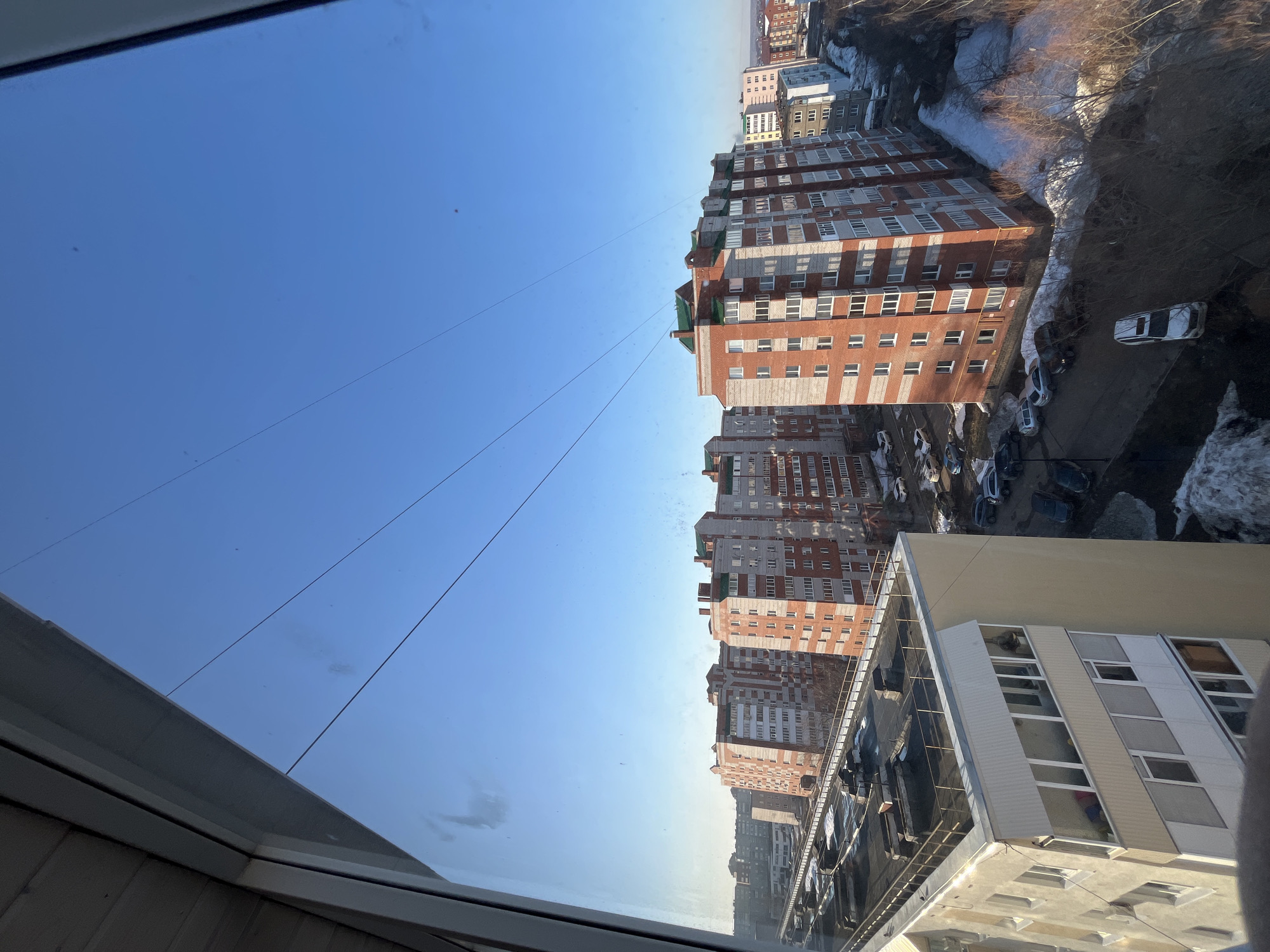 The image depicts a view from an elevated position, possibly a window, overlooking a city landscape