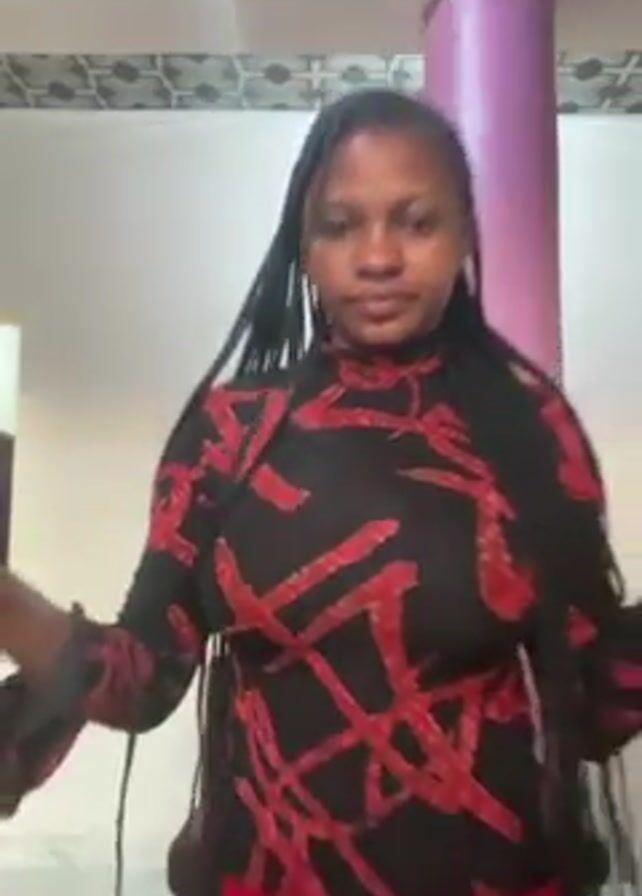 A young woman with long black braids stands indoors, holding a red plastic cup in her left hand