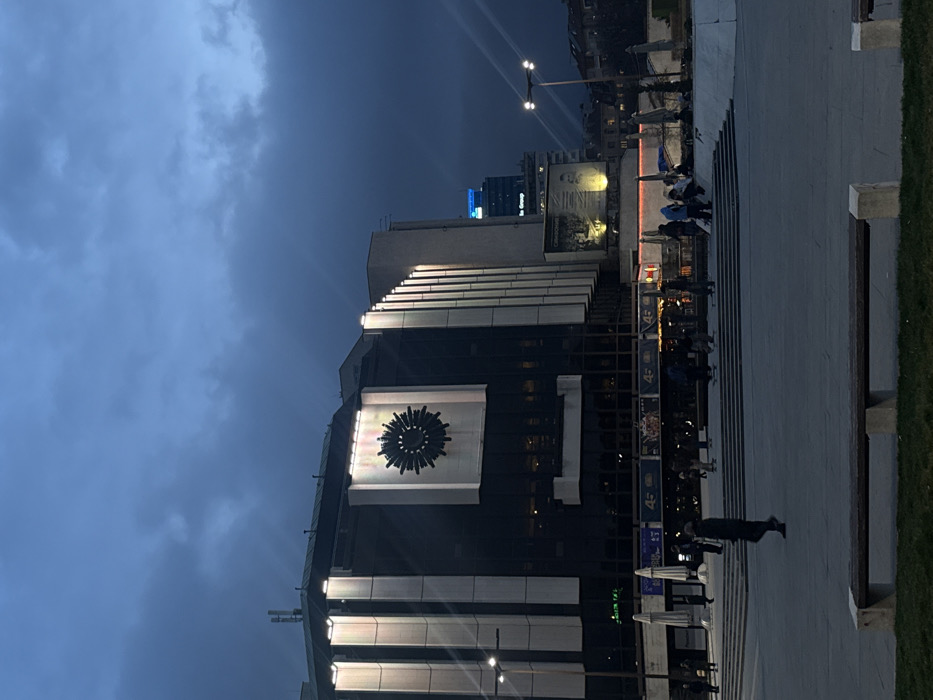 - "An outdoor, eye-level, wide-angle photograph captures the National Palace of Culture (NDK) in Sofia, Bulgaria, at twilight or evening, under a dark, cloudy sky" by FM-Uymtg1, licensed under CC BY 4.0