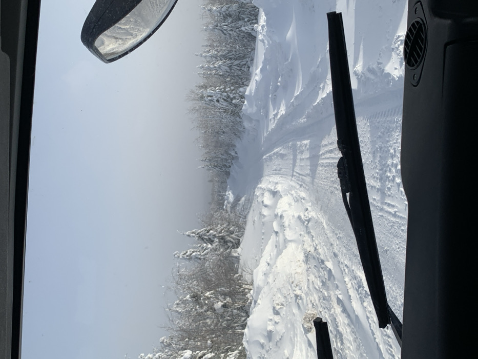 The image captures a winter landscape from the interior perspective of a vehicle in Novoye-Na-Lukhte, Russia. A snow-covered, unpaved road, showing visible vehicle tracks, extends into the distance, ascending slightly and curving towards the right. Dense forest lines both sides of the road, composed of numerous trees, predominantly evergreens and some deciduous, all heavily laden with snow. Large snow banks are accumulated along the road's edges. The background reveals a hazy horizon under a pale, light blue sky. In the immediate foreground, the vehicle's dashboard is visible, featuring a horizontal black windshield wiper blade. A section of the vehicle's right-side exterior mirror, partially obscured by snow or ice, is visible in the upper right. A vent is also visible on the lower right portion of the dashboard. No individuals are present in the scene.