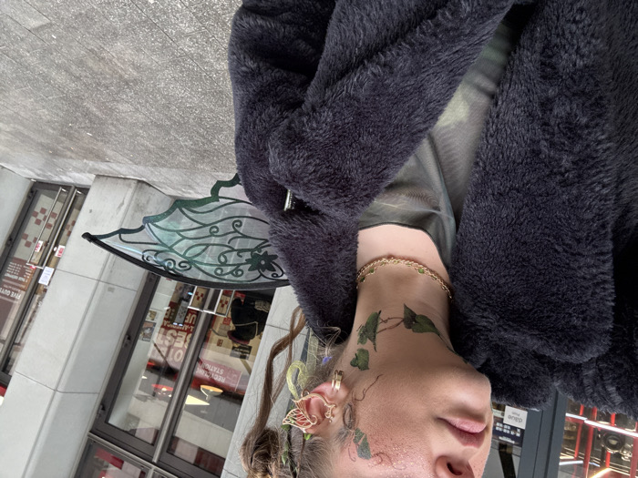 A subject is depicted in a close-up, partial view, oriented slightly to their right, positioned outdoors. They wear a dark, textured coat over a patterned green, translucent top and a gold chain necklace featuring small green accents. Green, vine-like temporary tattoos or makeup are applied to the right side of the neck and face, extending towards the temple, where subtle glitter is present. The visible right ear is adorned with a gold, leaf-shaped ear cuff and a simple gold hoop earring. Green, leaf-like decorations are integrated into the subject's hair, which is styled upwards. A translucent, green-tinted decorative wing with dark green scrollwork is visible on the subject's right side, extending from behind their shoulder. The background reveals a modern building with large glass doors, reflecting the interior and distinctive red-and-white branding of a "Five Guys" restaurant. A sign reading "RECYCLING STATION" is visible on the left glass door, alongside the reflection of another individual in a dark coat. The subject stands on a paved surface composed of light grey rectangular tiles. This scene is situated outside a Five Guys restaurant in Cologne, Germany.