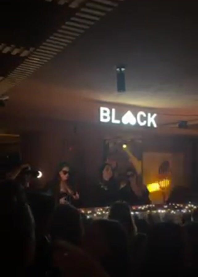 The video depicts a live performance in a dimly lit club called "BLACK." A crowd of people is gathered in front of a stage where five individuals are visible. They appear to be interacting with each other, with some gesturing. The lighting includes string lights along the front of the stage and stage lights that occasionally flash. The interior design features a dark, possibly wooden, paneling on the walls and ceiling.