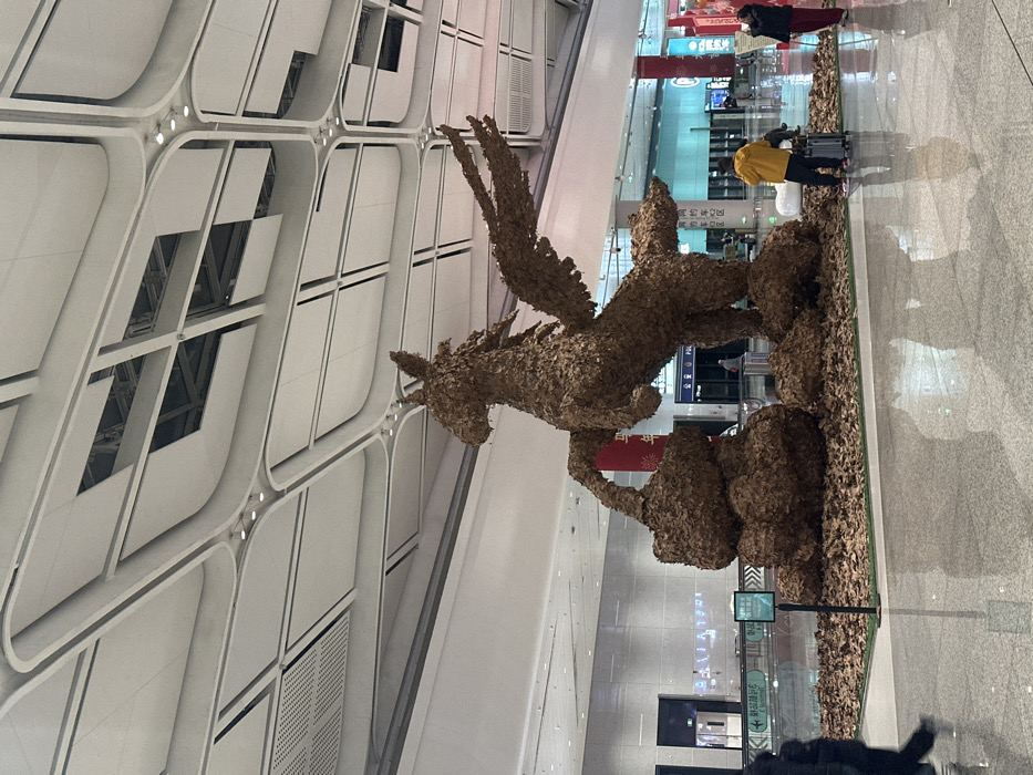 The image depicts the interior of Hangzhou Xiaoshan International Airport, located in Xiaoshan District, China. The scene features a large, elaborate sculpture constructed primarily from dried, brown leaves, centrally positioned on a square patch of green artificial turf. The sculpture portrays a rearing, winged pegasus-like creature with its front right hoof resting on a separate, large, irregularly shaped mound of leaves. Smaller scattered piles of leaves are arranged around the base of the main figures, contained within the green turf patch. The environment is a spacious, brightly lit airport terminal. The floor is a polished light gray, reflecting overhead lights and distant elements. The high ceiling features a complex, modern design composed of interconnected white, curved panels and numerous embedded circular light fixtures. In the background, various terminal features are visible: to the left, a moving walkway or escalator with green directional signage bearing Chinese characters; in the center-background, a dark blue sign with white Chinese text; and to the right, a large red banner with gold Chinese characters hanging from the ceiling, indicating a festive display. Several individuals are present. In the left foreground, a person in dark clothing walks out of frame to the left. In the right foreground, a person wearing a bright yellow hooded jacket and dark pants stands, pushing a silver rolling suitcase. To their right, another person in a dark top and red pants stands, appearing to photograph the sculpture with a phone. Additional indistinct figures are visible in the distant background of the terminal.