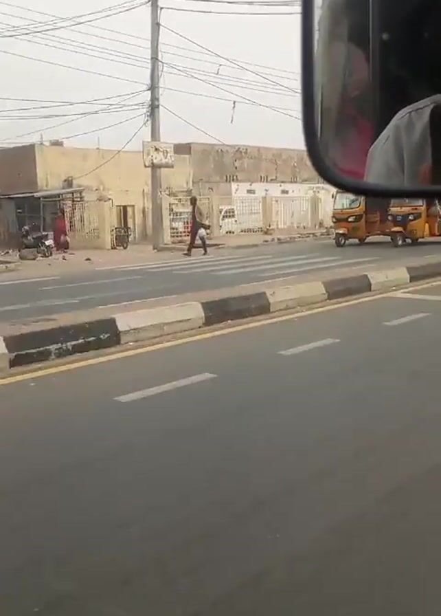 view from a moving vehicle driving on a paved road in what appears to be an urban area