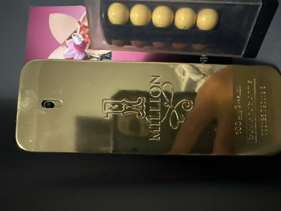 The image displays a gold-colored rectangular perfume bottle standing upright. Embossed text on the bottle identifies it as "1 MILLION" by "paco rabanne," with volume specifications "100 ml e 3.4 FL.oz." and the batch number "700120 790116 8." A black dispensing nozzle is visible at the top edge of the bottle. The highly reflective surface of the bottle shows a distorted reflection of a human face, including eyes and nose, and an indistinct hand or arm below the face, consistent with a person taking the photograph. To the right of the perfume bottle, a transparent plastic container holds a vertical stack of at least five yellow spherical objects. In the blurred upper right background, a pink object with a partial three-stripe or leaf-like design and a small, light-colored object adorned with a red ribbon are partially visible. The left background is dark and undefined. The scene is illuminated by an unseen light source, creating the reflections. This scene is located in the city of Levka, Bulgaria.
