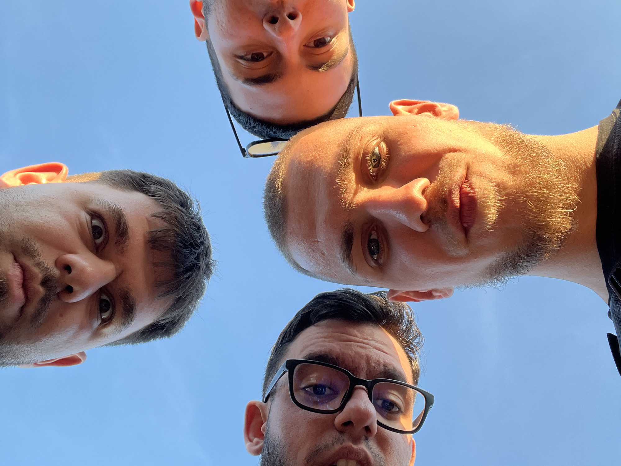 Four men are positioned looking downward into the camera