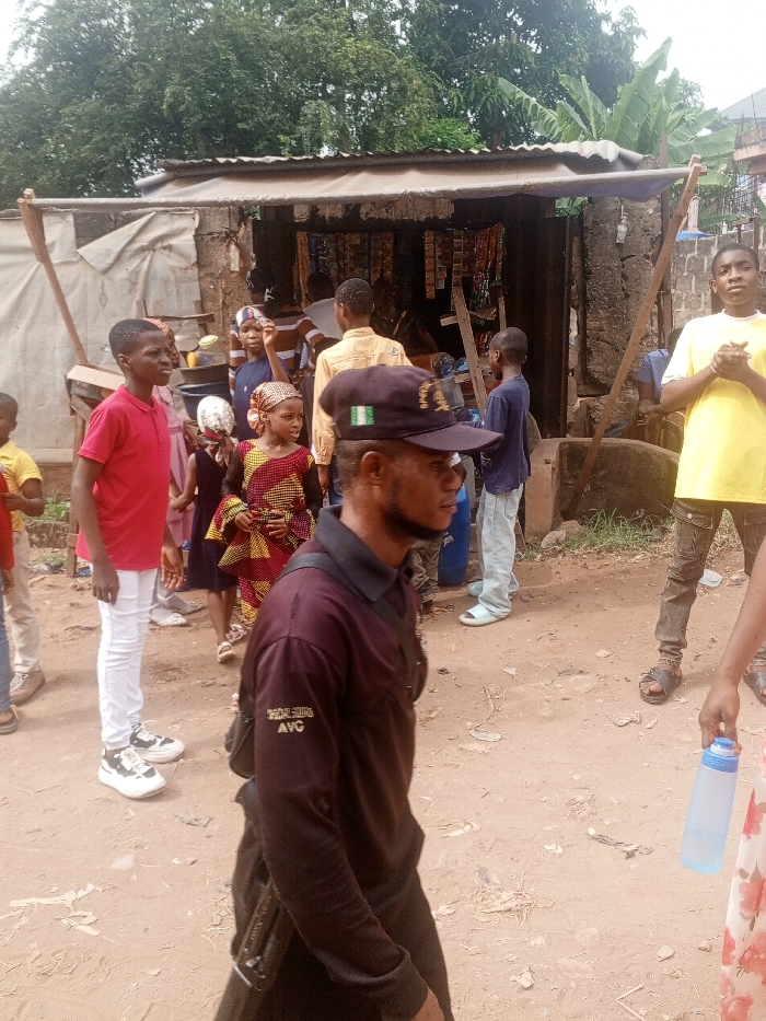 The image depicts an outdoor scene in Obosi, Nigeria, centered around an informal roadside shop. The ground is dirt, appearing uneven and dusty. In the foreground, a male subject in profile walks from left to right. He wears a dark maroon long-sleeved polo shirt with "SPECIAL SQUAD AVC" embroidered on the left sleeve and a dark baseball cap featuring the Nigerian flag emblem on the front. A dark bag is slung across his chest, and an obscured dark object is attached to his hip. Behind him, a group of approximately ten individuals, primarily young people and children, are standing. From left to right: * A young male wears a red polo shirt and white trousers with white and black sneakers, looking left. * A young female wears a patterned dress in red, yellow, and black, with a matching headwrap, looking right. * A male in a light brown long-sleeved shirt stands facing away from the camera, towards the shop. * A young male in a dark blue shirt and light blue jeans stands facing away, also towards the shop. * A young male in a yellow short-sleeved t-shirt and dark, possibly ripped, trousers with dark sandals stands to the far right, with hands clasped in front, looking towards the camera. * Other individuals are partially visible in the crowd and inside the shop. The central background features a makeshift shop constructed with concrete/mud walls and a corrugated metal roof. The front of the shop is open, displaying various packaged goods hanging for sale. Wooden poles support a lean-to extension from the shop's roof. Several plastic containers, including a blue barrel, are visible near the shop. Green foliage and trees are present in the distant background, suggesting an unpaved or semi-rural setting. An individual in the far right foreground holds a translucent blue water bottle.