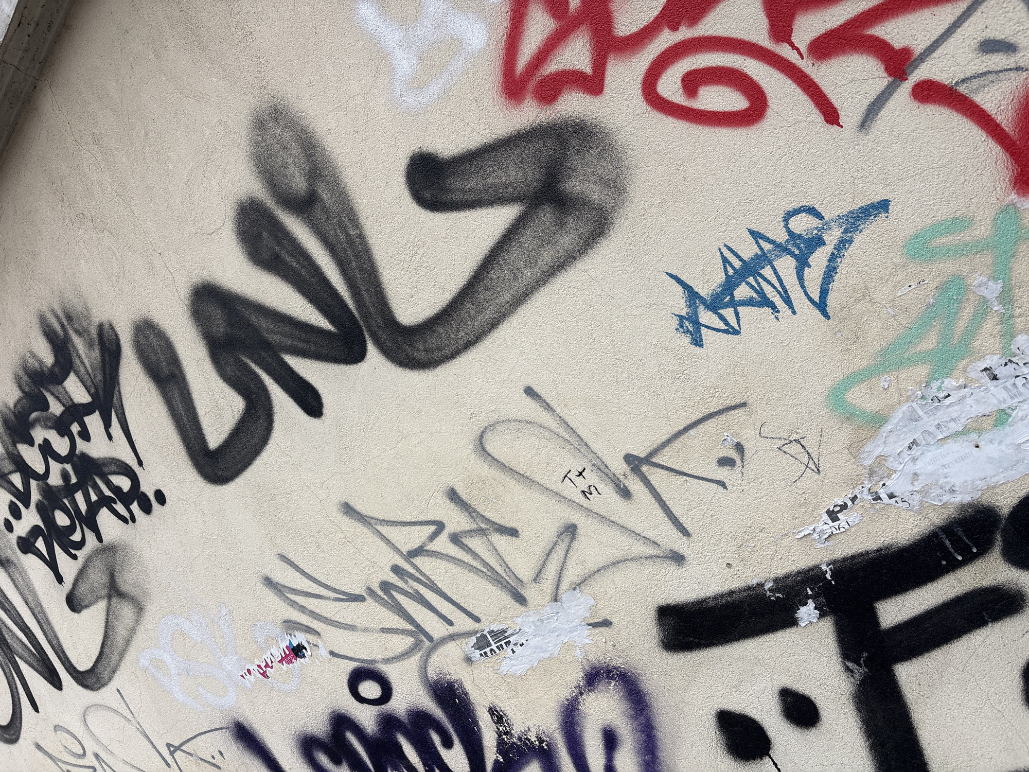 - "A close-up view of a beige exterior wall covered in assorted graffiti" by FM-PAz8K2, licensed under CC BY 4.0