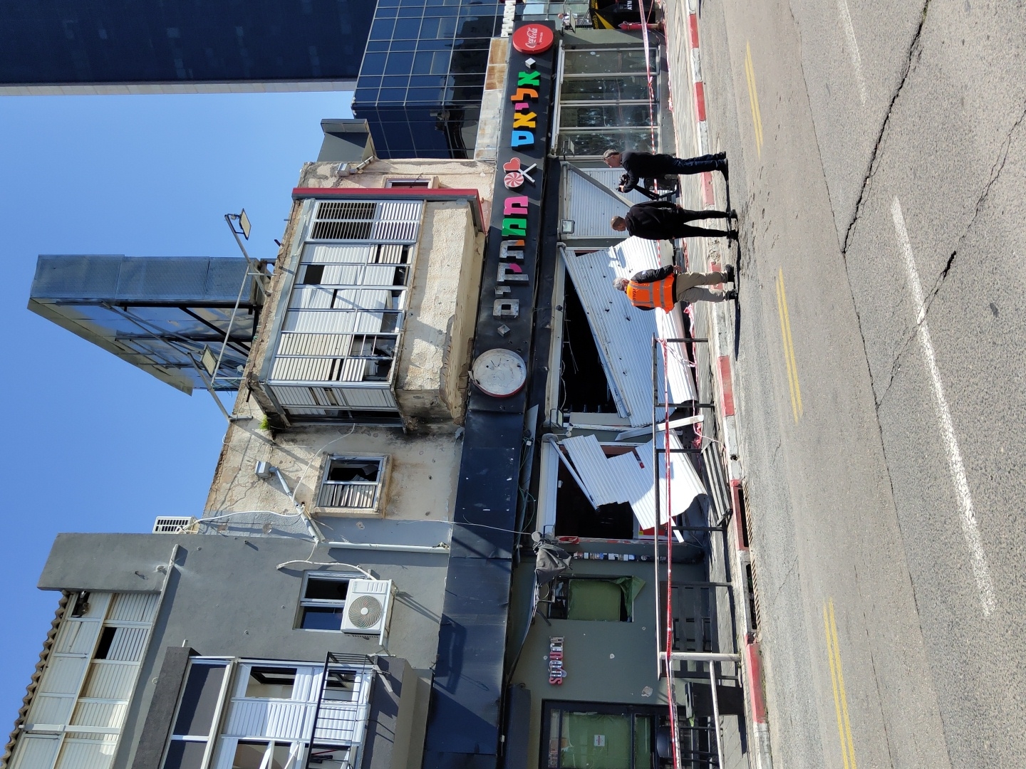 A daylight photograph captures a street scene in Givatayim, Israel, depicting a multi-story building with significant damage to its ground-floor commercial establishments. The central storefront shows a large, irregular void where the facade has collapsed outwards, exposing interior elements and leaving white, corrugated metal debris scattered on the sidewalk. Hebrew text, including "ממתקים" and "אליאס," is visible above this damaged section, alongside a partially visible Coca-Cola logo on the right. The adjacent storefront to the left, labeled "ShuPi," displays minor damage to its entrance. Upper floors of the building exhibit broken windows and damaged exterior shutters. The facade above the main damaged section appears weathered and cracked. An air conditioning unit is mounted on the wall of the gray building to the left, which features a balcony with a black railing. A large, reflective billboard structure is mounted on the rooftop, and a modern, dark-glass high-rise building is visible in the background on the far right. In the foreground, an asphalt street with yellow double-line and white solid-line markings shows surface cracks. A red and white painted curb separates the street from the sidewalk, where red and white hazard tape is stretched across the area in front of the damage, alongside a metal barrier. Three adult males are positioned on the street near the curb, observing the damaged structure. The leftmost man wears an orange high-visibility vest. The middle man is dressed in a dark hoodie. The rightmost man operates a video camera, holding it on his shoulder and directing it towards the compromised building. The sky is clear and blue, indicating bright, sunny weather conditions.