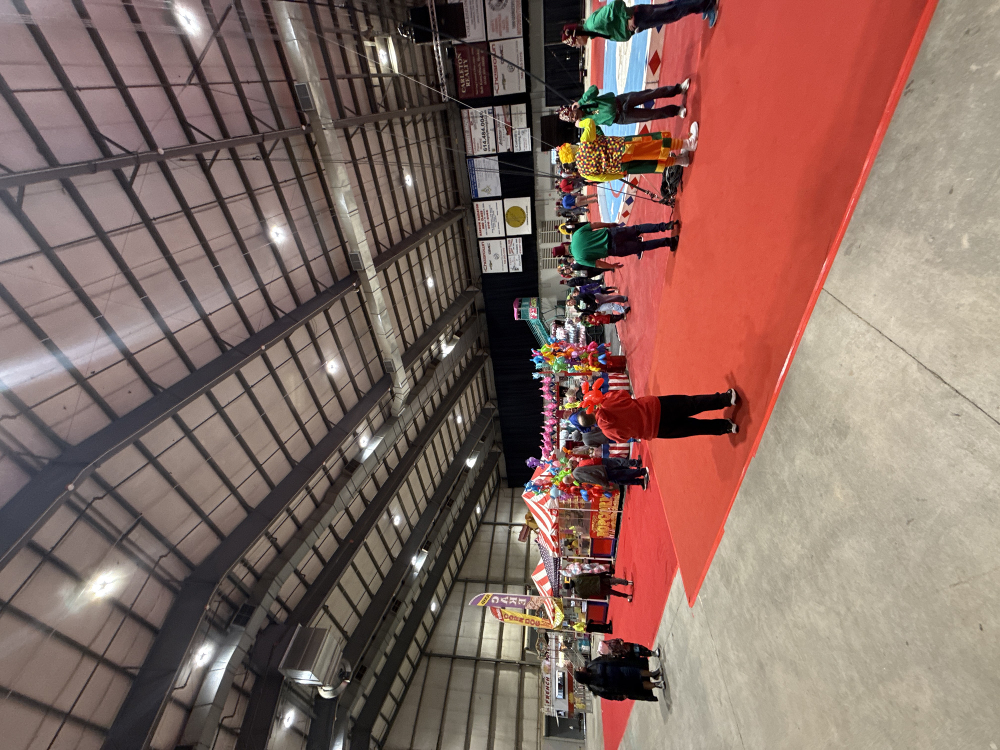 This image captures an indoor event within a large exhibition hall in Columbus, Ohio, United States. The city location is confirmed by the 614 area code and business names like "CARLETON REALTY" and "CHASSTOWN GMC" visible on advertisements along the far wall. The hall features a high, exposed metal truss ceiling with industrial lighting fixtures and ventilation systems. The floor consists of a grey concrete slab, with large sections covered by red carpeting that delineates event areas and pathways. Black drapes cover the far wall, serving as a backdrop for numerous advertising banners. The scene depicts a carnival or circus-style event. On the left side of the red carpet, multiple concession and game booths with red and white striped awnings are visible. One booth displays a "POPCORN" sign, and another appears to be a "FRENCH" food truck. Brightly colored balloons, including numerous pink animal shapes, are clustered around these booths. In the foreground left, a woman in a dark coat and a child holding a pink balloon animal stand on the concrete bordering the red carpet. On the right side of the red carpet, a group of four individuals is positioned near a circular blue and white mat, indicative of a performance area. One person wears a distinctive multi-colored clown costume with yellow, orange, and green diamond patterns. Three other individuals wear green shirts and red fezzes. Multiple other attendees are observed throughout the venue, walking or gathered near the attractions.