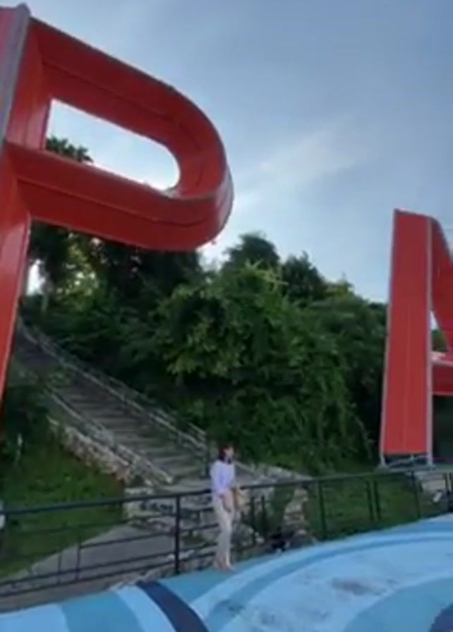 n elevated view of a coastal city and harbor. It begins with a focus on the large, red, block letters spelling "PATTAYA," a well-known beach city in Thailand. A woman stands near the letter "P," and later a man is seen taking a picture in front of the full sign. The camera pans out to reveal a view of the sea filled with numerous boats and some distant buildings along the shoreline. The sky is a bright blue with some white clouds scattered across it. Green trees and foliage border the area. A blue walkway, painted with swirling patterns, leads up to the letters.
