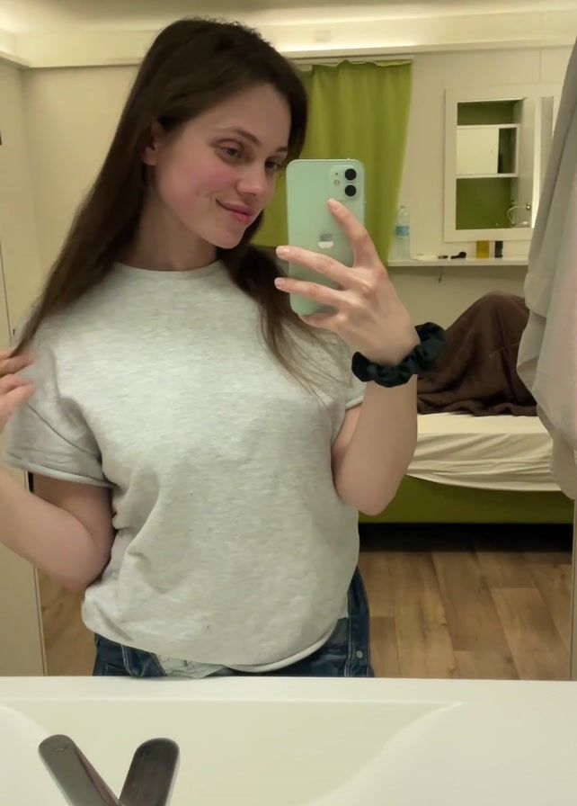 A woman stands in front of a bathroom mirror holding a green iPhone, taking a selfie. She is wearing a light gray t-shirt and denim shorts. Her long brown hair is down and she touches it with her left hand. Behind her, a bed with a green frame is visible, partially covered by a brown blanket. A window with green curtains is also in the background. The bathroom sink and faucet are in the foreground, reflecting the woman and the room.