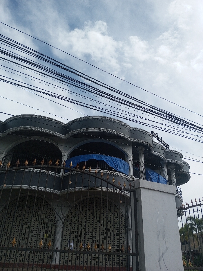 A multi-level building with gray and white facade, visible behind an ornate metal gate. The balcony of the upper level is covered with blue tarpaulin, suggesting construction or repair. A multitude of electrical wires stretch across the sky above the building. The overall scene suggests a daytime shot, under an overcast sky.
