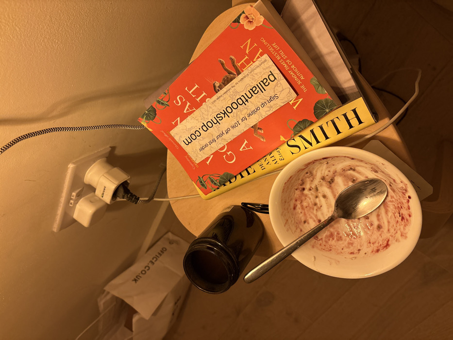 small table with various items. A book titled "AN" by William Nicholson and "SMITH" with the subtitle "THE SUNDAY TIMES BESTSELLING AUTHOR OF STILL LIFE" sits atop other papers. A Pallant Bookshop promotional sticker is placed on the book. Next to the book is an empty bowl with a spoon in it and a small black jar. A white electrical outlet is visible on the wall. The table also has an "OFFICE.CO.UK" branded paper bag. The image has a warm, yellowish lighting.