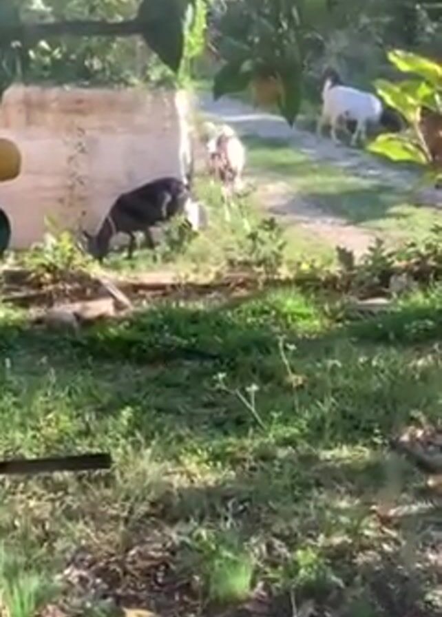 The scene showcases four goats grazing in a lush, overgrown backyard on a sunny day. One goat is black, two are white with black markings, and one is mostly white. They move freely, feeding on the grass and other vegetation. A concrete structure with stairs is in the background. A tree branch with hanging citrus fruit is on the left, partially obscuring the view.