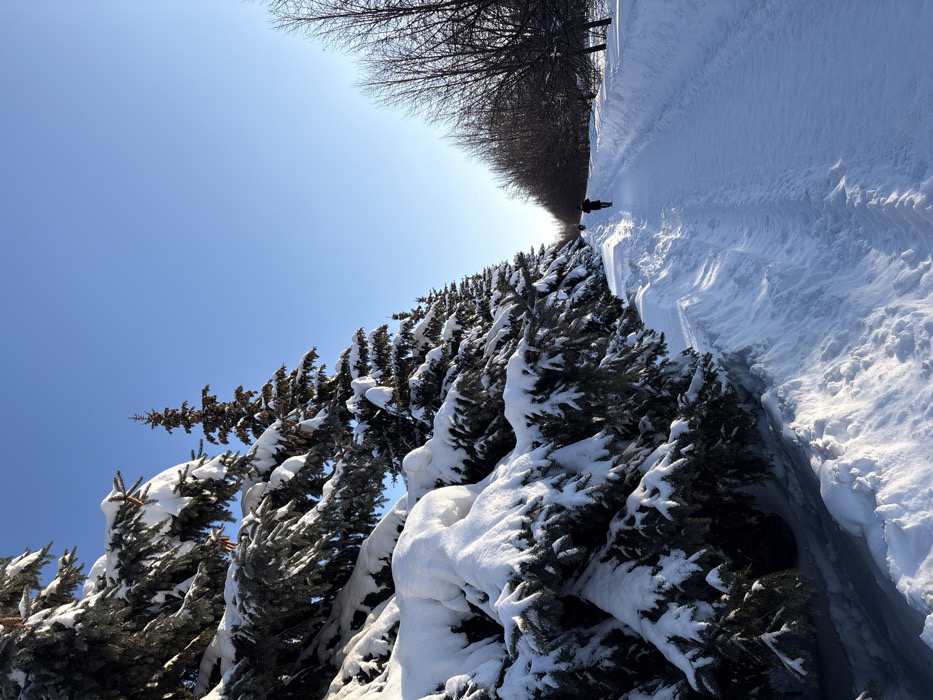 The image depicts a snow-covered park pathway on a clear winter day in Kazan, Russia. A deep blue, cloudless sky dominates the upper half of the frame. On the left, a dense row of evergreen trees, likely spruce or fir, stands heavily laden with thick white snow on their branches, casting subtle shadows. Several brown pine cones are visible on these snow-dusted trees. To the right of the pathway, a parallel line of bare deciduous trees indicates the winter season. The ground consists of a well-trodden, snow-covered path, flanked by significant snowdrifts that rise on both sides. One individual, dressed in dark winter attire, is visible walking away from the viewer on this path in the mid-ground. Another, smaller dark figure is discernible further down the path. Sunlight illuminates the scene, creating bright highlights on the snow and casting subtle shadows, suggesting a clear, cold day.