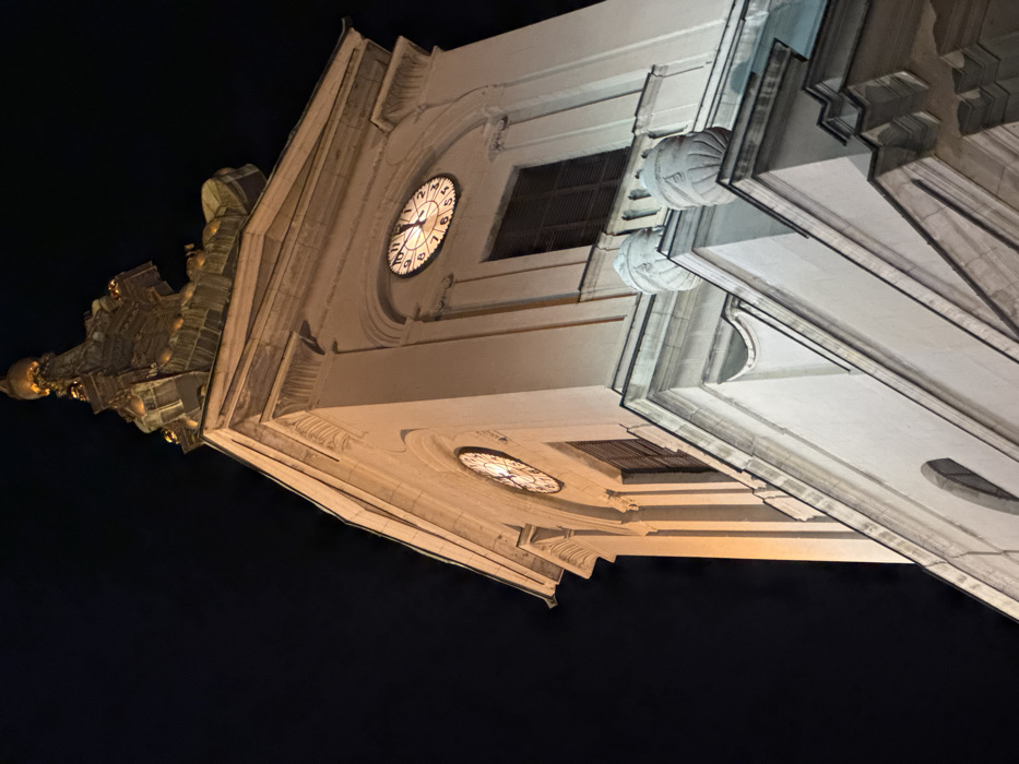 The image captures a low-angle, upward-looking view of the illuminated bell tower of the Cathedral Church of St. Michael the Archangel (Saborna Crkva Svetog Arhangela Mihaila) at night. This architectural landmark is situated at Kneza Sime Markovića 3, in the Old Town of Belgrade, Serbia. The tower, constructed of light-colored masonry, is lit by artificial warm-toned lights, contrasting sharply with the dark, featureless night sky. Two circular clock faces are visible on the tower's upper section; the more prominent face, oriented towards the viewer, displays Roman numerals and indicates a time nearing midnight, approximately 11:55. Below these clock faces are recessed, rectangular window openings, appearing dark, possibly indicating closed shutters or louvers. The tower features classical architectural elements including prominent cornices, moldings, and pilasters. A lower tier of the tower, beneath the main clock level, is adorned with two decorative, urn-shaped finials. The tower culminates in an ornate, multi-tiered spire topped with golden-colored spherical elements and a central finial at its apex. No individuals, actions, or interactions are present in the scene.