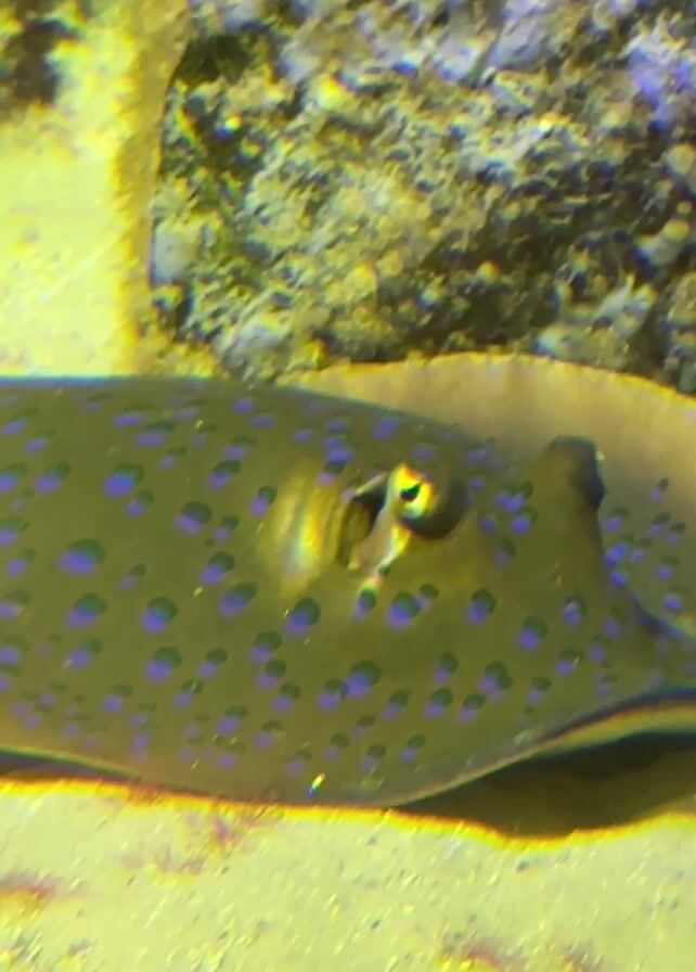 ray in an aquarium. At first, the camera is zoomed in on the ray's eye, but then it zooms out and the ray is seen lying on the sandy bottom of the tank. There are other fish swimming around, as well as a person's reflection in the glass. The aquarium is decorated with rocks and coral.