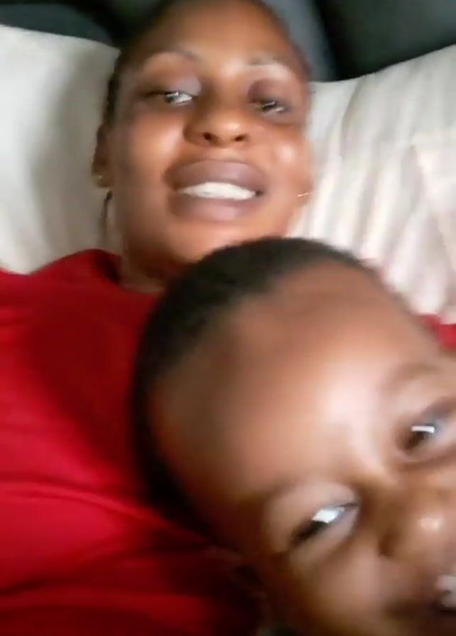 A woman and a young child are lying on a bed in a close-up shot. The woman is wearing a red shirt and has short hair. She is looking at the camera and smiling. The child is lying on her chest and is also smiling. The child has short hair and is wearing a grey shirt. There is a white pillow behind the woman and grey fabric in the background. The lighting is natural. The camera appears to be handheld, resulting in a slightly shaky image.