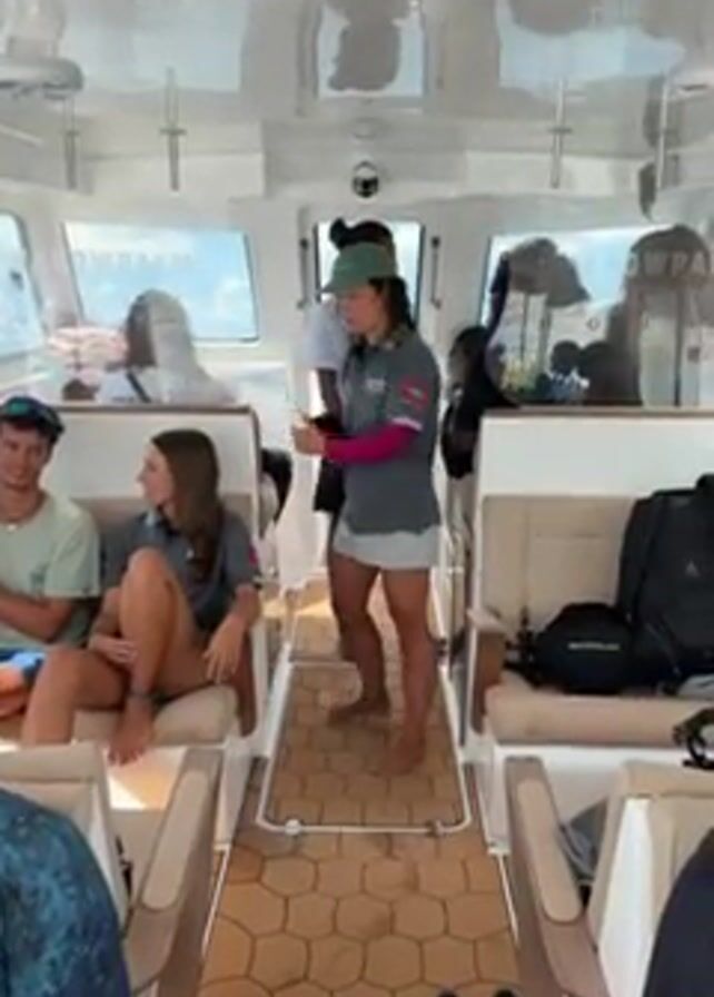 interior of a small boat, presumably on a tour or excursion. Several people are seated along the sides, facing each other. An employee in a gray shirt, shorts, and a green cap is speaking to the group and holding a camera. Another employee in a white shirt and black shorts stands near the front of the boat. Snorkels, fins, and bags are visible on the floor of the boat. The boat interior is clean and modern, with white paneling and a light brown, patterned floor. Windows line the sides of the boat, providing views of the outside.