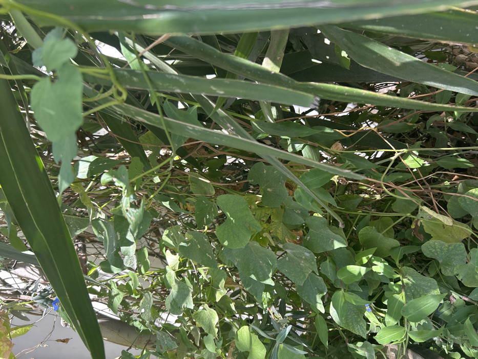 close-up view of a dense, green, leafy plant growing against a white wall. The plant is primarily composed of long, slender leaves with some smaller, heart-shaped leaves. There is a single blue flower visible, tucked behind the larger leaves. The image is likely taken in a residential area of Tel Aviv-Yafo, Israel, as the coordinates provided correspond to a residential neighborhood. The plant appears to be a type of vine, possibly growing up a trellis or fence. The leaves are in focus, while the background is slightly blurred. There is no sign of any people, animals, or other objects in the scene.
