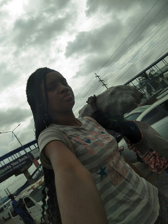 An outdoor image, captured under an overcast sky with dense grey clouds, depicts a street scene in Ajah, Nigeria. In the foreground, a young Black female with long, dark braided hair takes a selfie, her right arm extended towards the camera. She wears a horizontally striped t-shirt featuring light grey and white stripes with pink text, blue hearts, and a blue star design. Her lips are slightly pursed. To her right and partially obscured, another individual is seen from the torso up, carrying a large, light-colored sack on their head/shoulder. This person wears a dark garment under a patterned or woven vest. In the mid-ground, a pedestrian bridge with blue railings and a large billboard advertising "TRUSTS YOU BACK." and "Free Credit. Shop In-app." spans the roadway. Multiple utility poles with power lines are visible on the right. Various vehicles, including white vans parked on the left and other light-colored cars on the right, populate the scene. A distant figure in blue attire is visible near the parked white vans on the left. The overall lighting is diffused.