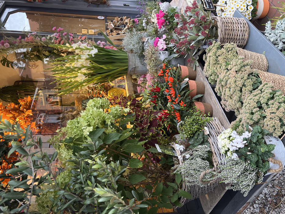This image captures a vibrant outdoor display of a flower shop located in Croix, France. The scene is dominated by a dense arrangement of various plants and cut flowers presented on multi-level wooden and metal display structures. In the foreground, a gray metal pot with rope handles holds a white flowering plant, possibly cyclamen or heather, next to a larger gray wicker basket containing a similar white flowering plant. Adjacent to these are several woven straw or wicker baskets filled with sedum plants, characterized by their clusters of light green to cream-colored flowers. Towards the mid-ground, a large gray wicker basket on a wooden shelf contains a leafy green shrub, likely an olive tree, accompanied by a plant with large light green hydrangea-like blossoms. Below this, multiple terracotta-colored pots with woven bases showcase plants bearing bright red chili peppers. Further right, a collection of plants with reddish-purple foliage (likely coleus) is arranged. Grey textured pots contain pink cyclamen plants. A tall, galvanized metal bucket serves as a central feature, holding a substantial bouquet of white gladioli with prominent green stems. To its immediate right, a smaller wicker basket contains a plant with reddish berries or buds, and a white informational sign is partially visible. Further right, an easel displays a circular, wreath-like arrangement of dried natural materials. The background reveals the shop's large glass window, which reflects portions of a building across the street, showing warm orange and brown hues. Inside the shop, through the reflections, additional plants with green and red foliage are discernible, along with what appears to be hanging orange floral arrangements. The overall impression is one of abundance and natural beauty, meticulously arranged for display. No individuals are present in the image.