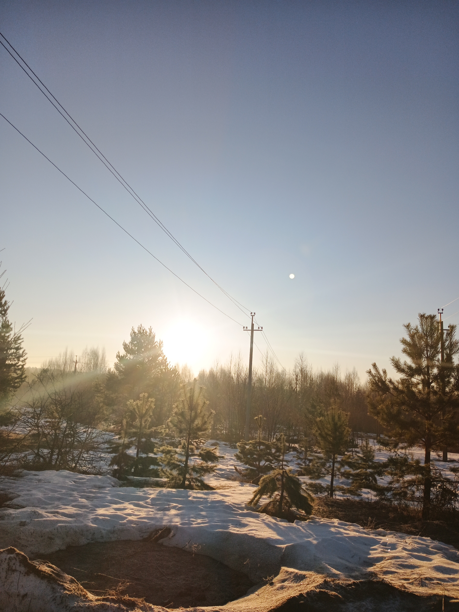 winter landscape with snow on the ground. A line of trees occupies the middle ground, illuminated by the sun, which is high in the sky. Power lines and a utility pole are visible above the trees on the right and left. In the foreground, a patch of snow covers the ground. The location is unknown. There are no people in the image.