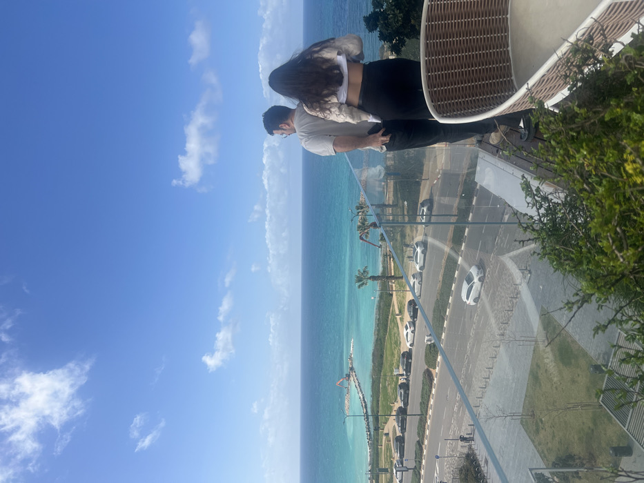 The image depicts a coastal panorama in Netanya, Israel, viewed from an elevated position, likely a balcony or terrace, overlooking the Mediterranean Sea