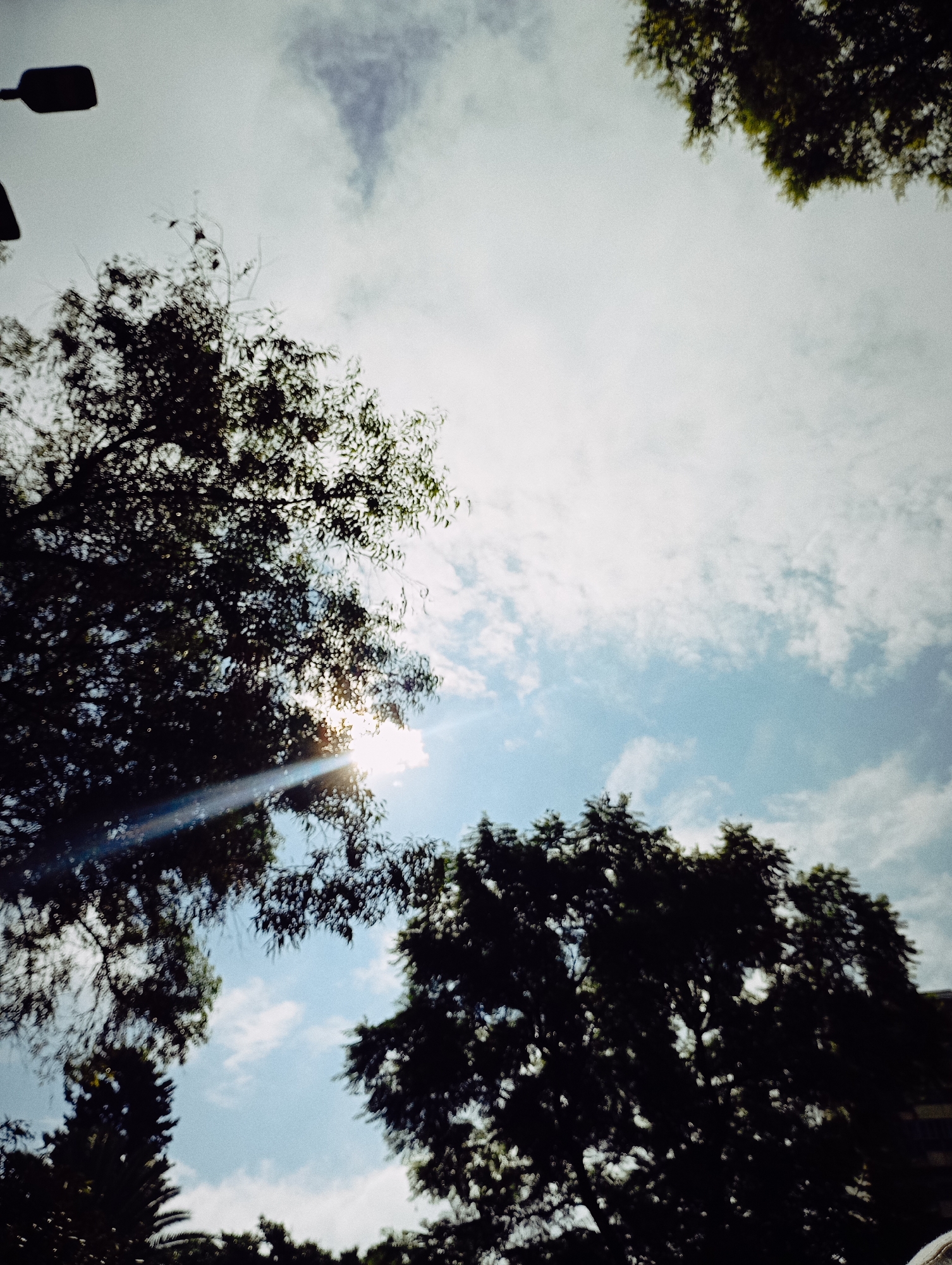 view looking up towards the sky, framed by trees on the sides and bottom. The sky is partially cloudy with patches of blue. Sunlight filters through the leaves, creating a lens flare effect. A streetlight is visible on the left side. There is no way to determine the image's specific location. No people or subjects are visible.