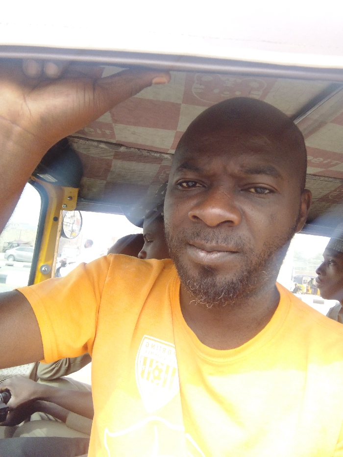 A male individual with dark skin, a shaved head, and a short, dark beard is positioned centrally in the foreground, looking directly at the camera. He wears a bright orange short-sleeved t-shirt with a light-colored emblem on the chest. His right hand is raised, gripping an overhead frame or support within the vehicle. The scene is set inside an open-sided commercial vehicle, likely a tricycle, in Gyadi Gyadi Arewa, Nigeria. The vehicle's interior features a light-colored roof lining with a red and white checkered pattern. A yellow structural frame is visible on the left side of the vehicle's opening, incorporating a circular reflective object. Two other individuals are partially visible: one behind and to the left of the central figure, with only the top of their head and shoulder visible, wearing a light-colored garment; and another on the far right, seen in profile, wearing a cap. An arm and hand belonging to a third individual are visible in the lower-left quadrant, near what appears to be a vehicle control panel. Through the open side of the vehicle, a bright daytime outdoor environment is visible. This includes a paved surface, a light-colored car in the mid-ground, and faint distant structures or hills under a bright sky.