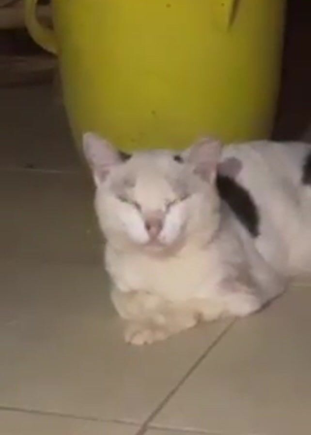 - "A video shows a white cat with black spots laying on a tan tile floor" by FM-SP1IA3, licensed under CC BY 4.0