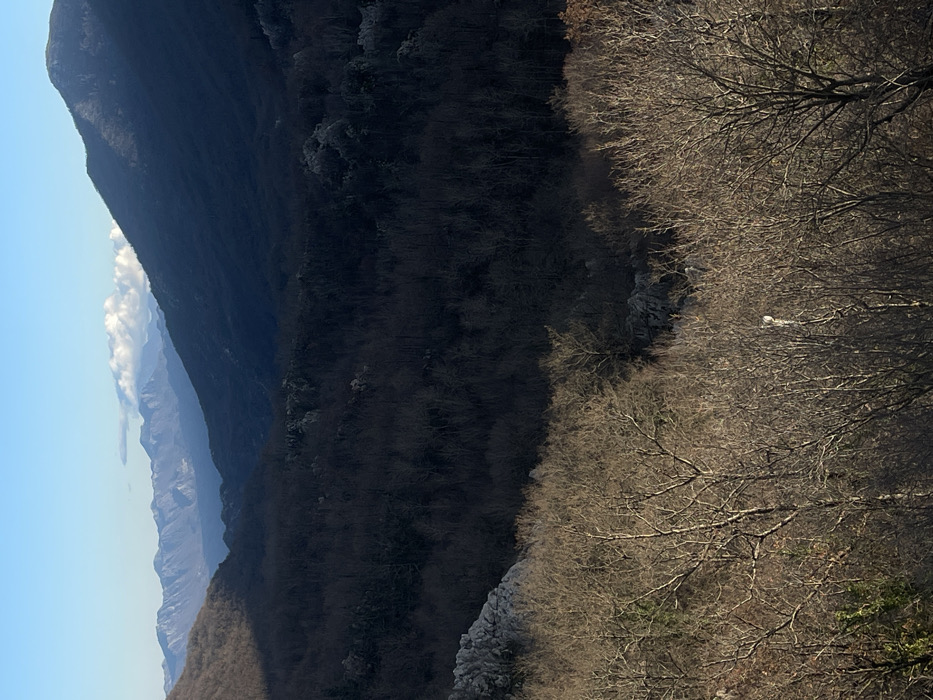 An elevated landscape view depicts a mountainous region within Brajici, Montenegro, under a clear, bright blue sky with scattered white clouds on the horizon. The foreground consists of dense, bare deciduous trees, illuminated by direct sunlight, revealing branches and trunks in shades of brown and tan. A large, light-colored rocky outcrop is visible on the lower left. The midground features a deep valley primarily covered by a dense, dark forest, largely in shadow, with some smaller rocky formations interspersed. Beyond this valley, multiple layers of mountains recede into the distance, exhibiting varying shades of blue and grey, with their upper peaks partially obscured by a light atmospheric haze. No human activity or structures are discernible.