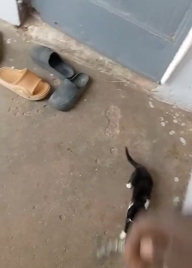 A kitten plays with a string in front of a gray door. The kitten is black and white, and the person holding the string is also visible, with brown skin and a black t-shirt sleeve. Several pairs of sandals and slip-on shoes are scattered near the door. The floor is concrete with several patches of discoloration. The person moves the string, and the kitten paws at it.