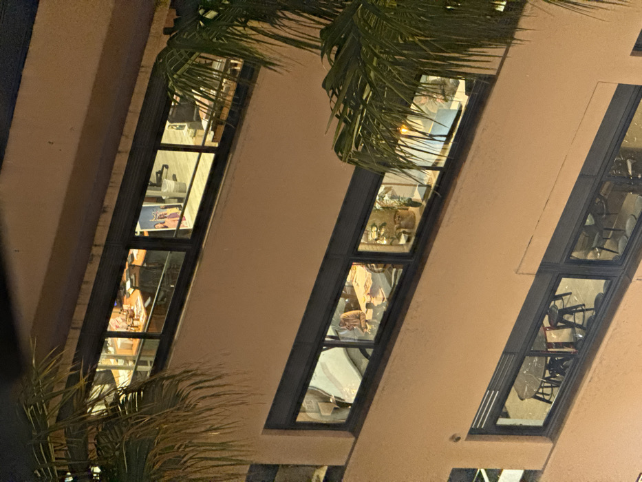 Three tall, narrow windows are visible on a beige building facade. Dark window frames divide each window into multiple panes. Reflections within the glass show furniture, including stacked chairs in the right window, while the others reveal interiors filled with various items. A partial view of palm tree foliage appears at the top and bottom left. The scene is captured at night, with artificial lights illuminating the interior spaces.