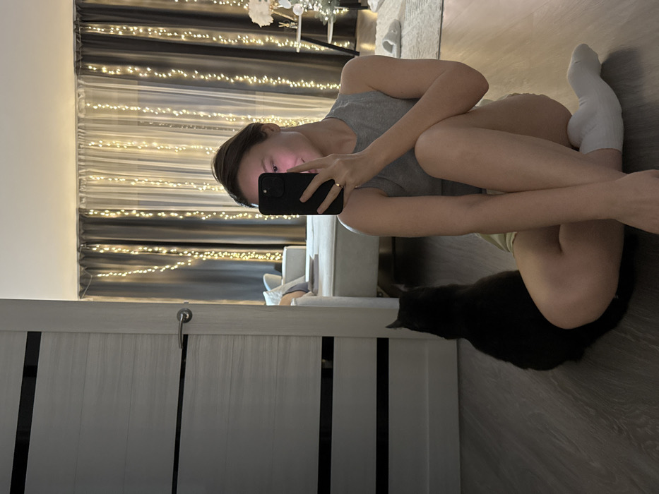 An individual, appearing to be an adult female, is seated cross-legged on a dark wooden floor in a residential interior in Sosnovoborsk, Russia. She is wearing a grey tank top, light-colored shorts, and a white sock on her left foot. A ring is visible on her right hand as she holds a black smartphone to her face, obscuring the upper left portion, while capturing a mirror selfie. To her immediate left, a black cat sits on the floor, facing away from the camera, observing the background area. The room features light and dark grey curtains adorned with multiple vertical strands of illuminated warm-toned fairy lights. A light-colored sofa or bed is partially visible in the left background, while a small side table with a white decorative object and a pair of light-colored slippers on a light rug are present in the right background. A light-colored door with two black horizontal stripes and a silver handle is partially open on the far left. The scene is illuminated by artificial ambient light.