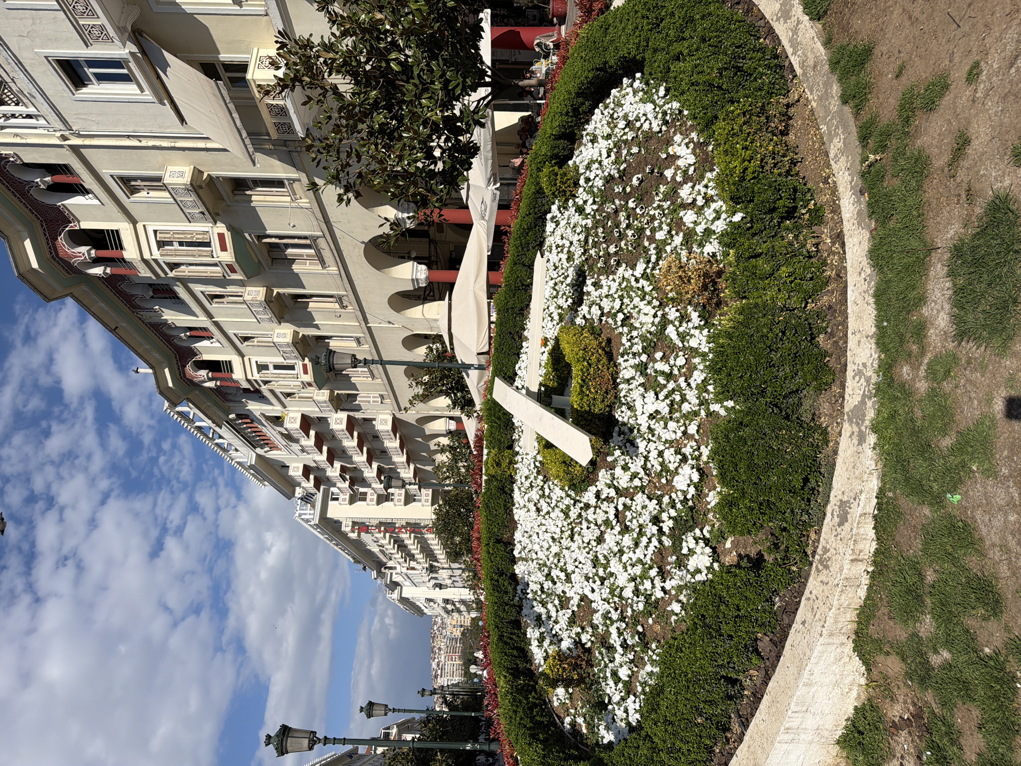 The image displays a ground-level view of Aristotelous Square in Thessaloniki, Greece, facing north. A large circular flower clock dominates the foreground, featuring numerous white flowering plants arranged within concentric rings of dark green hedges. A light-colored, angular marker, potentially a sundial gnomon or decorative clock hand, projects from the central area of the floral arrangement. The immediate ground consists of patchy green grass and exposed soil. To the left and right, ornate black lampposts line a central pedestrian divider. Beyond this, multi-story cream-colored buildings with neoclassical or eclectic architecture flank the square. These structures feature balconies with decorative railings, numerous windows, and distinctive red-accented arched details on their upper facades. The ground floors are characterized by recurring arched colonnades, beneath which awnings are extended on some establishments. On the right side, under the building's arcade, an outdoor cafe is active, equipped with cream-colored umbrellas and tables. Several individuals are seated at these tables, engaged in dining or social interaction. Green trees with dense foliage, possibly magnolias, are interspersed along the square, and beds of red-leafed plants delineate pedestrian zones. The sky is blue with scattered white cumulus clouds. A dark bird is visible in flight in the upper-central part of the frame. In the far distance, beyond the main square, a densely populated hillside with additional urban development is discernible.