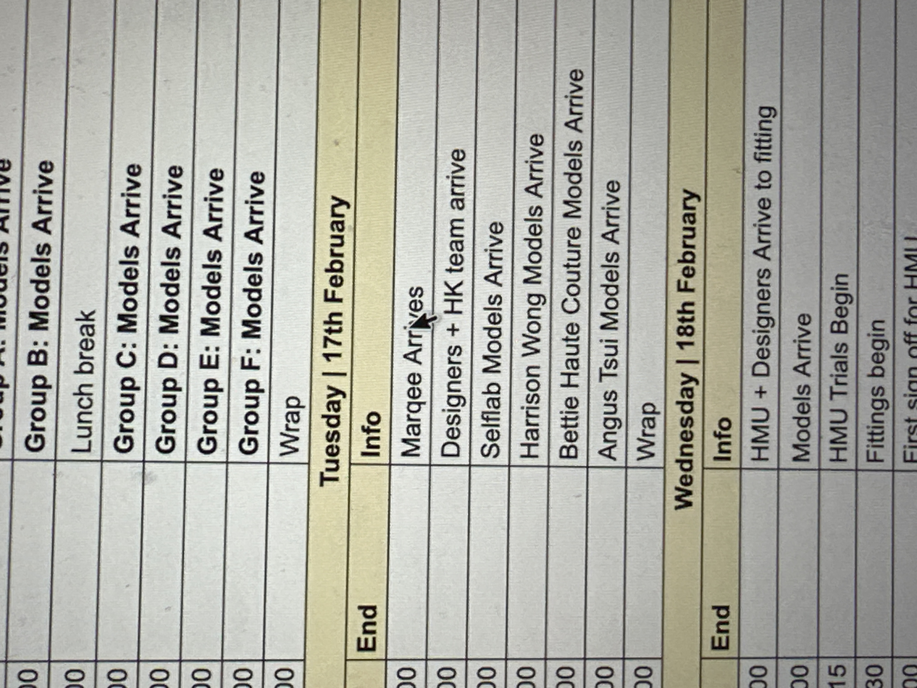 This image displays a digital screen showing a detailed event schedule, likely for a fashion or media production, located in Wealden, United Kingdom. The visible schedule spans three days: part of an unspecified Monday, Tuesday the 17th of February, and Wednesday the 18th of February. The Monday entries include "Group B: Models Arrive," "Lunch break," "Group C: Models Arrive," "Group D: Models Arrive," "Group E: Models Arrive," "Group F: Models Arrive," and "Wrap." A highlighted row denotes "Tuesday | 17th February," with subsequent entries: "Marquee Arrives" (a black mouse pointer is positioned over the word "Arrives"), "Designers + HK team arrive," "Selflab Models Arrive," "Harrison Wong Models Arrive," "Bettie Haute Couture Models Arrive," "Angus Tsui Models Arrive," and "Wrap." Another highlighted row marks "Wednesday | 18th February," listing "HMU + Designers Arrive to fitting," "Models Arrive," "HMU Trials Begin," "Fittings begin," and "First sign off for HMU." The schedule includes time columns, partially obscured, indicating event start or end times, with visible entries of '00' and '15', '30'. The background of the schedule is white with black text and horizontal grid lines, and the day headers are highlighted in yellow.