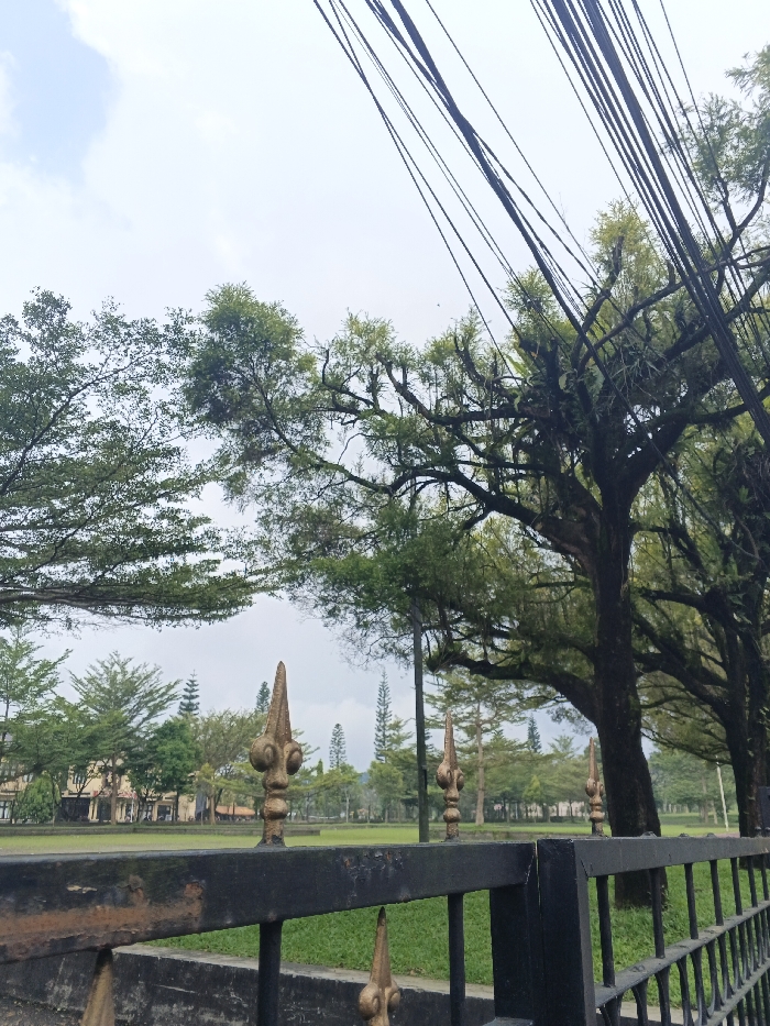 The image displays an outdoor daytime scene in Makilala, Philippines, under an overcast sky. In the foreground, a black metal fence with four visible, worn gold-painted ornamental finials extends horizontally across the lower section of the frame. Beyond the fence, a expansive green lawn is present. The midground features several multi-story buildings with light-colored facades and dark roofs, interspersed with numerous trees, including distinct conical conifers and large broadleaf trees. A large broadleaf tree with light green foliage occupies the upper left quadrant. On the right, a row of mature trees with dense, dark green canopies and visible epiphytic growth forms a prominent vertical element. A cluster of black utility lines diagonally traverses the upper right portion of the image, positioned above and through the rightmost trees. No individuals, animals, or vehicles are discernible within the scene.