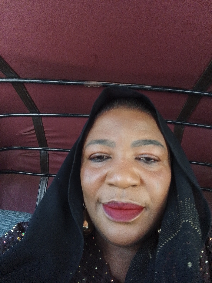 An adult female is depicted in a medium close-up, occupying the central frame. She possesses a medium-dark complexion and is looking directly at the camera with a slight smile. Her eyebrows are well-defined, and she wears winged eyeliner and dark red lipstick. She is adorned with a black head covering that drapes over her head and shoulders, showing gold-colored embellishments on the right side (viewer's left). A dark, possibly sequined garment is visible beneath the head covering. A single gold-colored teardrop-shaped earring is visible on her left ear (viewer's right). The background indicates the interior of a vehicle, characterized by a dark red fabric ceiling lining and a horizontal black metal frame or support bar running across the upper portion of the image. The fabric exhibits minor creases and some faint discoloration. The location is Unknown, Unknown.