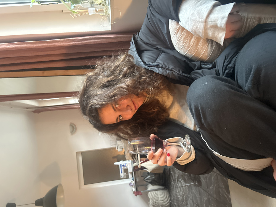 A medium-shot photograph depicts a female subject seated indoors within a residential or studio setting in Sofia, Bulgaria. The subject, a woman with dark, voluminous curly hair, is positioned centrally, looking directly at the camera with a slight smile. She is wearing a dark-colored puffer jacket over a light grey long-sleeved top and dark athletic pants. Her right hand, featuring a red-polished index fingernail, holds a clear stemmed glass containing a quantity of red wine. She leans against a light-colored, horizontally ribbed or padded cushion. In the background to the subject's left, an adjacent room or workspace is visible through an open doorway or archway. Within this area, a white sewing machine is prominent on a surface, with various items including textured white objects and a dark bag on the dark-colored floor. A dark-shaded pendant light fixture hangs from the ceiling, and a white wall-mounted sconce is affixed to the wall. To the subject's right, a window is partially obscured by reddish-brown curtains. A small plant in a clear container and a reed diffuser are visible on the windowsill. The ambient lighting suggests a mix of natural light and indoor illumination.