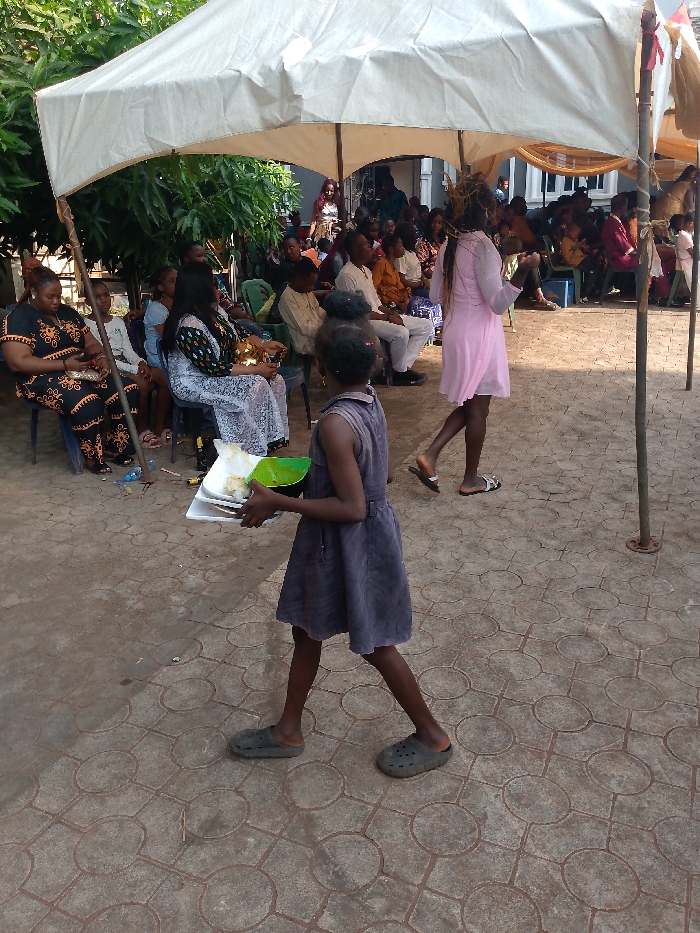 A young girl in a purple dress and dark-colored crocs walks across a paved surface, holding a tray with plates and a green bowl. She's at an outdoor event under a white tent. People are seated in the background, watching an event. A woman in a pink dress walks in the same direction as the girl. The area appears to be a courtyard or event space with tiled paving stones.