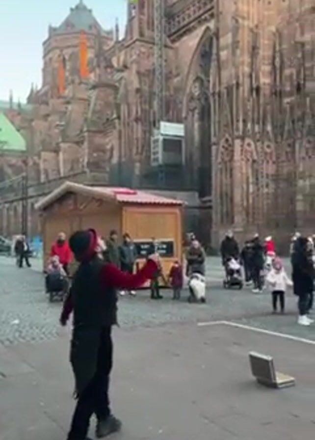 street performer juggling three yellow balls in front of a large crowd near a cathedral. The juggler is wearing black pants, a black vest, and a red undershirt. He also has a black hat. The crowd consists of people of all ages, many of whom are children, dressed in winter clothes. A dog also stands among the spectators. Some are standing and others are pushing strollers. A small wooden booth is to the side of the juggler and a silver briefcase sits closed on the ground. The cathedral is made of reddish-brown stone and is ornately decorated. There are market stalls around the base of the cathedral. The sky is a light blue with a hint of evening glow.