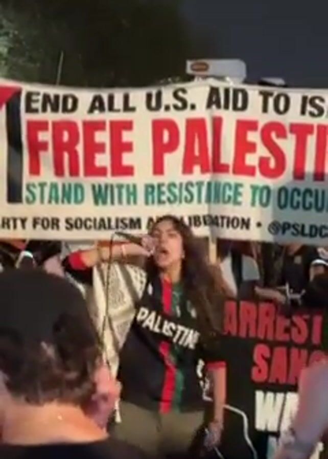 crowd of people at a protest. A woman with long brown hair stands at the front, speaking into a microphone. She's wearing a black jersey with "Palestine" on it, a shawl, and an olive-colored skirt. Behind her, a large banner reads "End All U.S. Aid to Israel, Free Palestine." Smaller signs in the crowd are visible, one saying "Arrest Netanyahu." The scene takes place outdoors at night. People in the crowd are looking at the speaker and holding signs. The general atmosphere is one of protest and demonstration.
