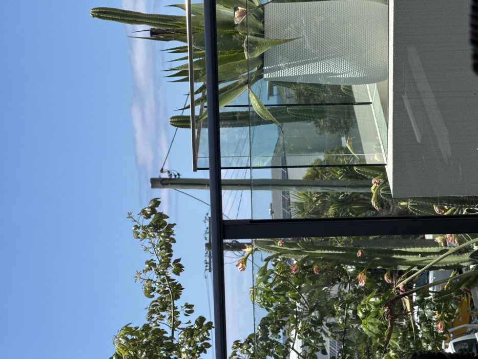 A low-angle shot reveals a mix of nature and architecture. A clear blue sky peeks behind green foliage, including cactus and blooming bushes. A glass balcony reflects the surroundings, creating layered imagery. A utility pole stands in the background. The composition is captured from a tilted perspective, adding a dynamic feel.