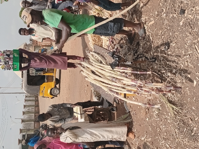A group of men stand around a pile of sugarcane stalks in Badiko, Nigeria. One man is holding a crate of goods on his head. Another man is preparing the sugarcane for sale. A few other men stand by. A yellow auto rickshaw is parked in the background. There is debris and discarded sugarcane stalks on the ground.