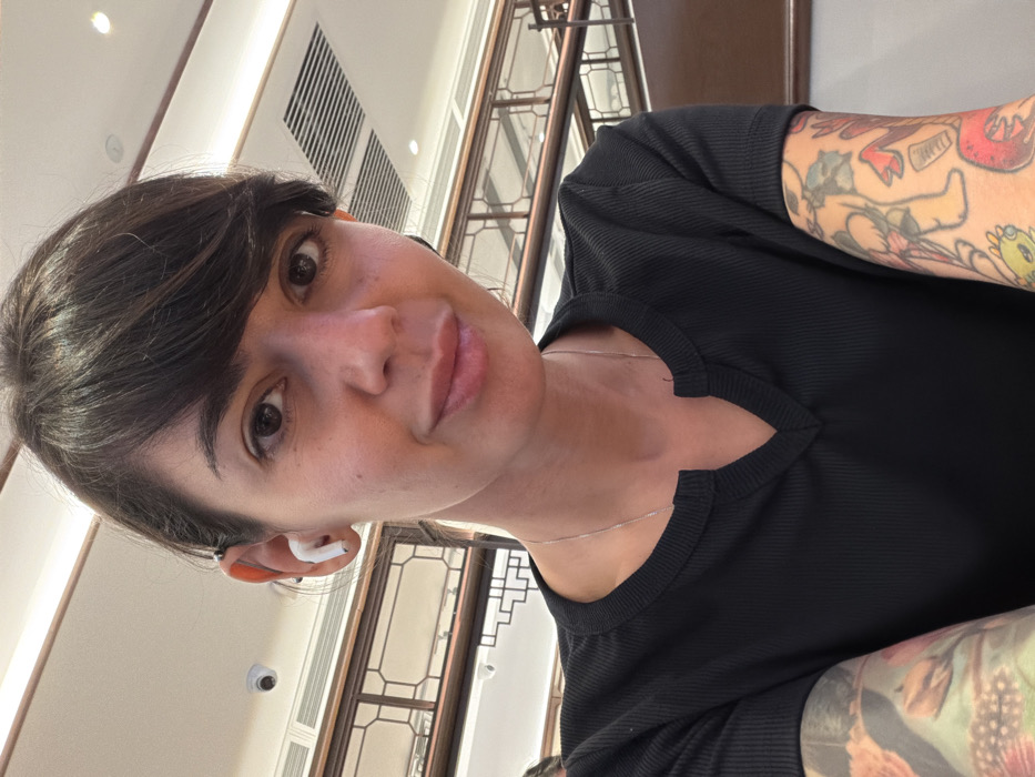 A female subject is depicted in a self-portrait within an establishment located in Guangzhou City, China. She has dark brown hair with bangs, dark eyes, and fair skin, with her lips curved upwards slightly. She is wearing a black, ribbed, short-sleeved shirt with a V-neck notch and a thin silver chain necklace. A white wireless earbud is present in her left ear, along with a dark-colored ear cuff on the helix. Both forearms are extensively covered with colorful tattoos featuring various stylized figures and patterns. The background indicates an indoor setting with a white ceiling, equipped with multiple recessed light fixtures, a metallic-grilled air conditioning vent, and a black dome security camera. Dark wooden latticework, characteristic of traditional Chinese architectural style, forms a decorative railing or partition behind the subject. A partial view of another individual's shoulder and head is visible on the far left edge of the frame.