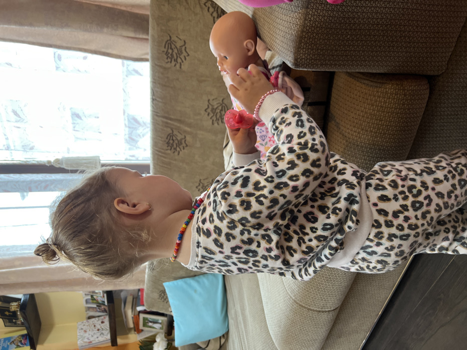 An indoor scene in a residence in Dospey, Bulgaria, depicts a young child standing and interacting with a doll