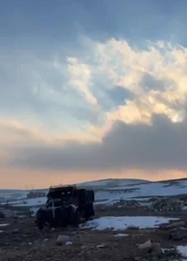 landscape with light snow cover under a sky with clouds illuminated by the setting sun. In the foreground, there is a damaged, dark-colored vehicle. In the distance, power lines are visible across the land.