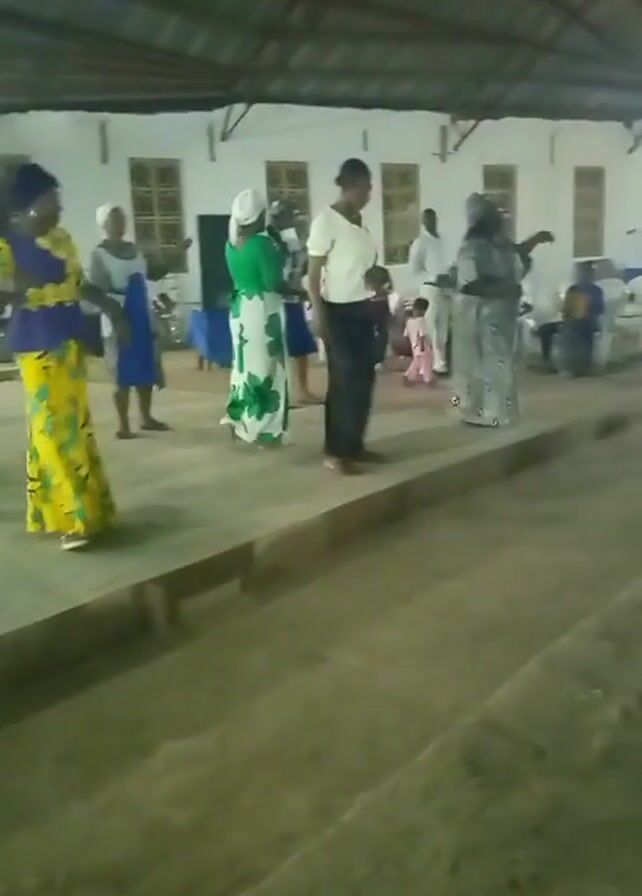 group of women dancing on a concrete platform in what appears to be an indoor space, possibly a church or community hall. The women are dressed in colorful, patterned dresses, and some wear head coverings. They are moving rhythmically to music, though the music is not clearly audible in the video. A few other people are visible in the background, some seated. The space has a simple, utilitarian feel, with white walls, windows with grids, and a corrugated metal roof. The lighting is somewhat dim. The camera is stationary but shaky.